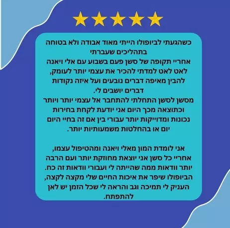 ובסוף הטיפול את תצאי עם כלים פשוטים ותחושה מדהימה שיובילו אותך לשיפור באיכות החיים!