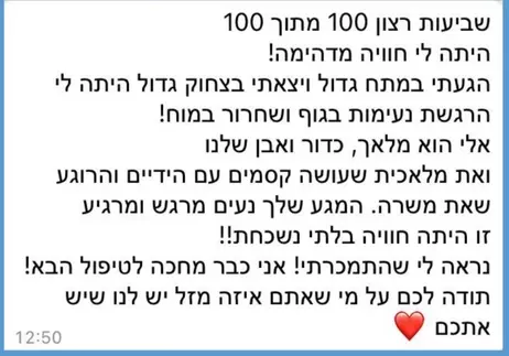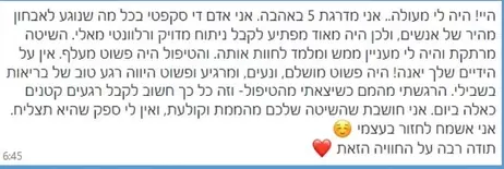רצוי להגיע כל שבוע וזה כולה שעה, בשעה את מקבלת מעטפת טיפולית גם מבחינה נפשית וגם פיזית,